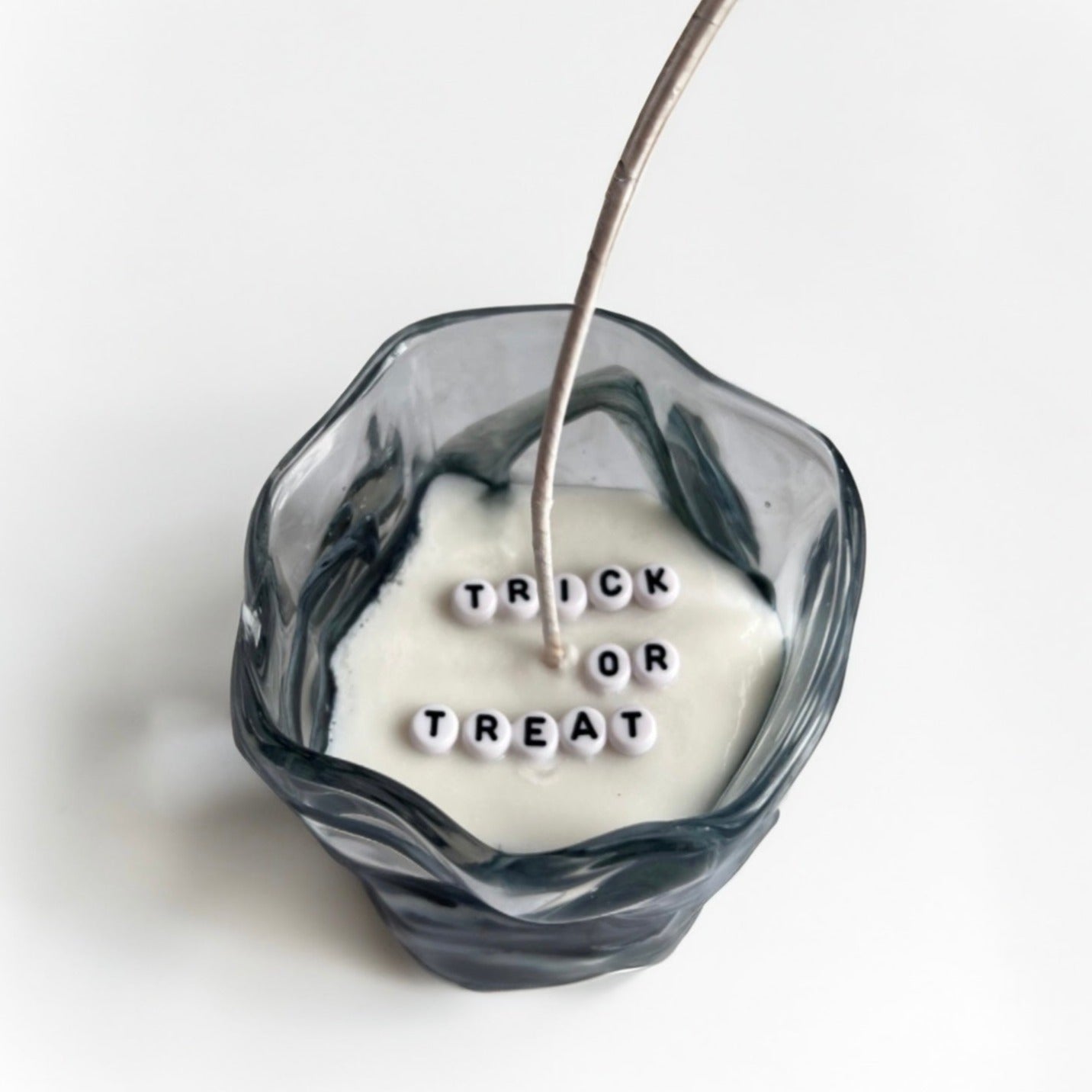 Trick or Treat è una candela di soia realizzata con ingredienti naturali e profumata con oli essenziali. Stai cercando il tocco perfetto per creare quell'atmosfera misteriosa e magica durante la cena di Halloween? O magari stai cercando un regalo straordinario per sorprendere i tuoi amici o familiari? La nostra candela "Trick or Treat" è proprio quello che ti serve! La fragranza unica di bubble gum e incenso è stata appositamente creata per incantare i tuoi sensi e trasportarti in un mondo di magia e mistero. La sorpresa sta nel fatto che dopo pochi minuti dall'accensione, quando la cera comincia a sciogliersi, appare la frase magica "Trick or Treat". È una sorpresa che nessuno si aspetta e che renderà il momento ancora più speciale!