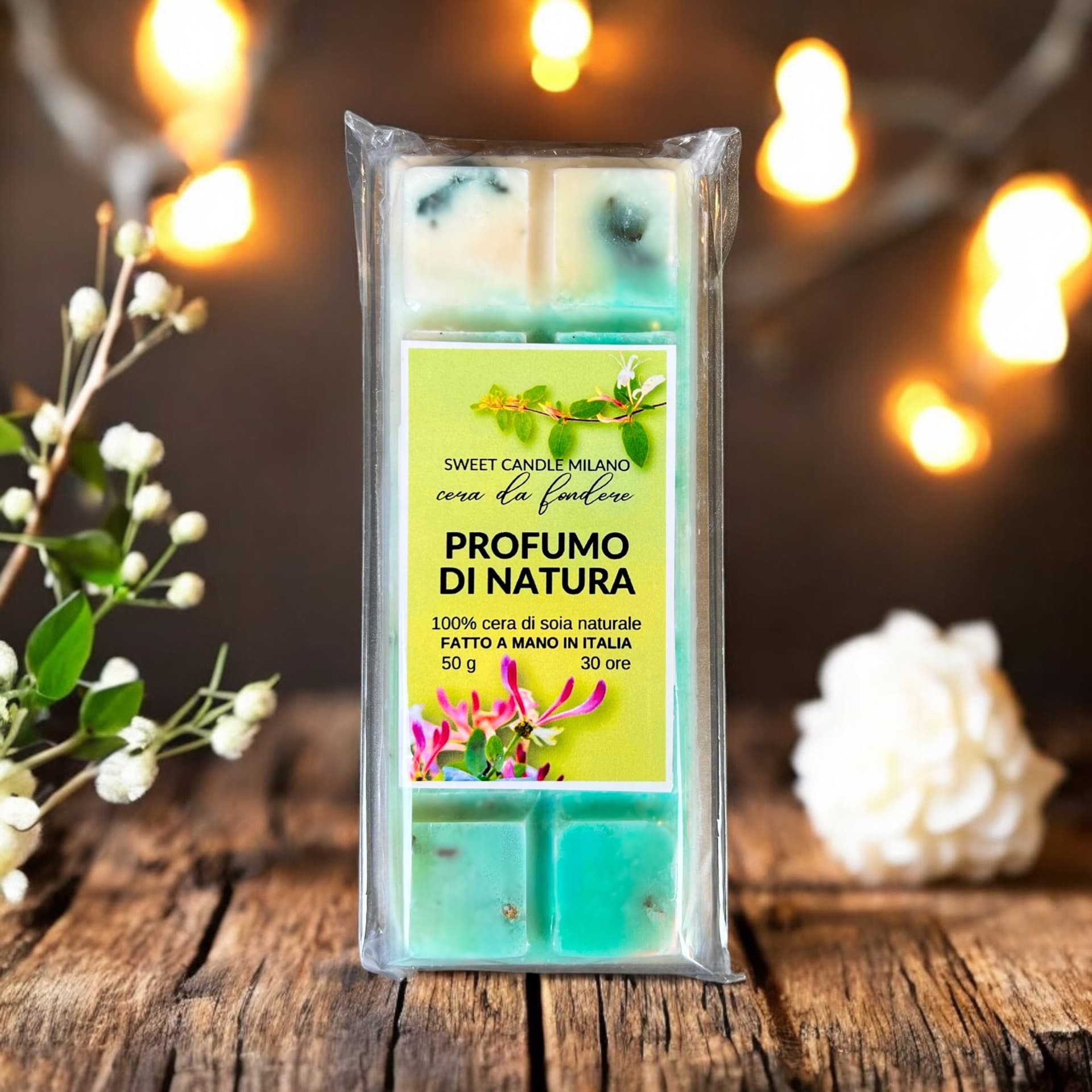 Profumo di Natura è una tart di soia, realizzata con ingredienti naturali e profumata con oli essenziali puri. La nostra tart è come un respiro di aria fresca durante una giornata estiva. Questa fragranza è una sinfonia di note leggere e floreali che unisce la purezza del lino, la freschezza del cetriolo e la dolcezza del caprifoglio. L'esperienza sensoriale inizia con note fresche e pulite, creando un'atmosfera che ricorda il bucato steso all'aria aperta in una giornata di sole. Ogni volta che sciogli questa tavoletta di cera, sentirai una brezza di purezza estiva che invita al relax e alla serenità. È l'ideale per creare un'atmosfera leggera e rinfrescante in casa tua, regalandoti una pausa di tranquillità in ogni momento dell'anno