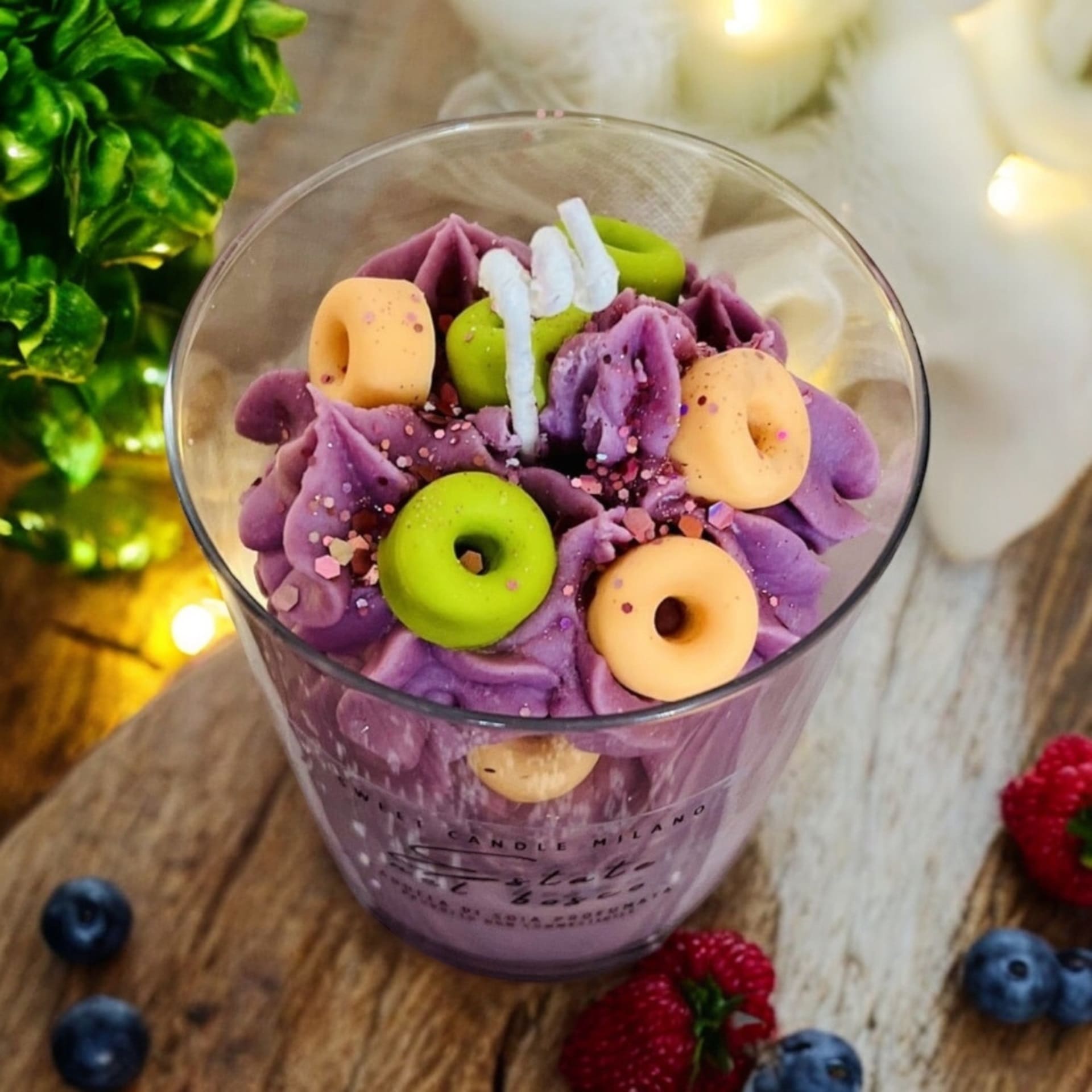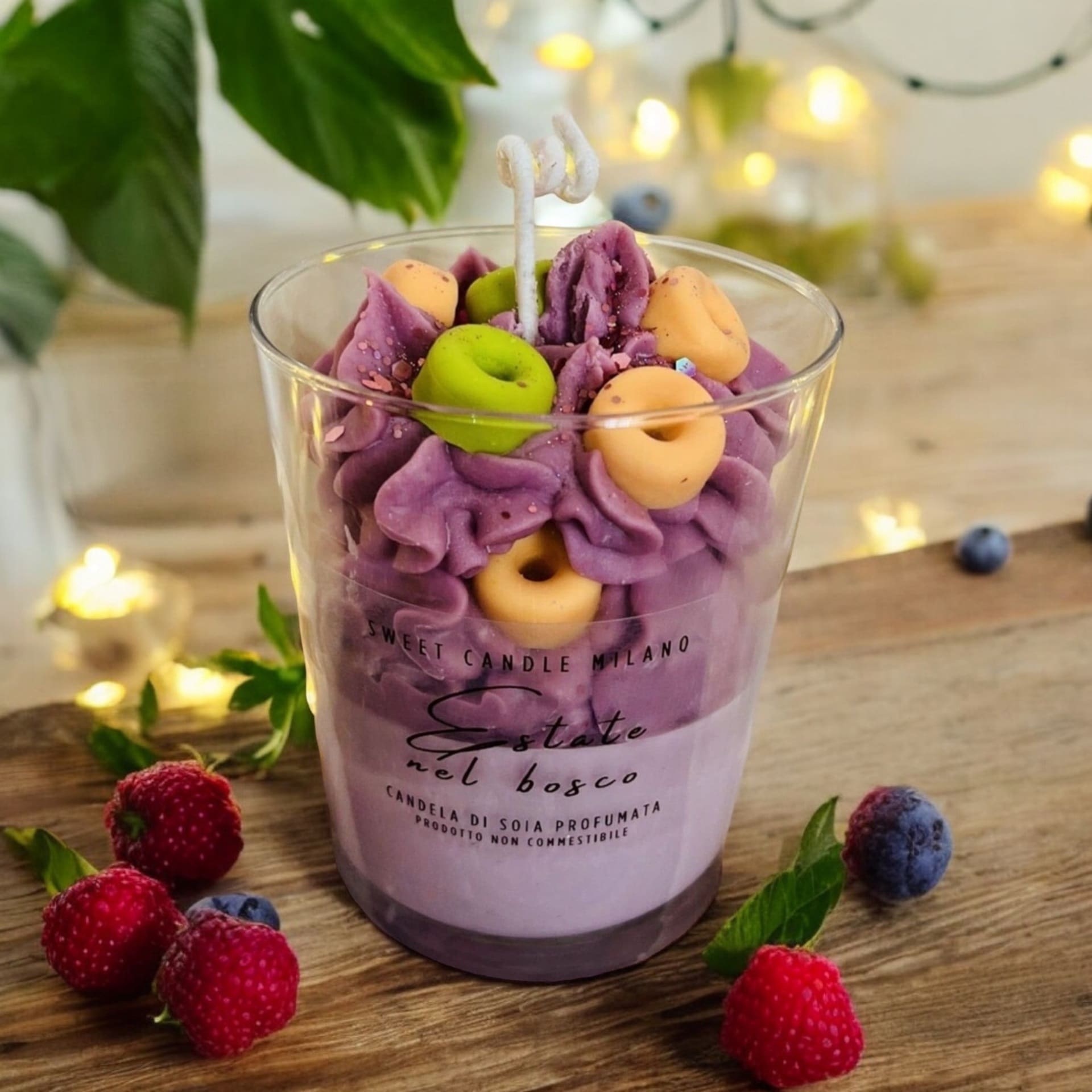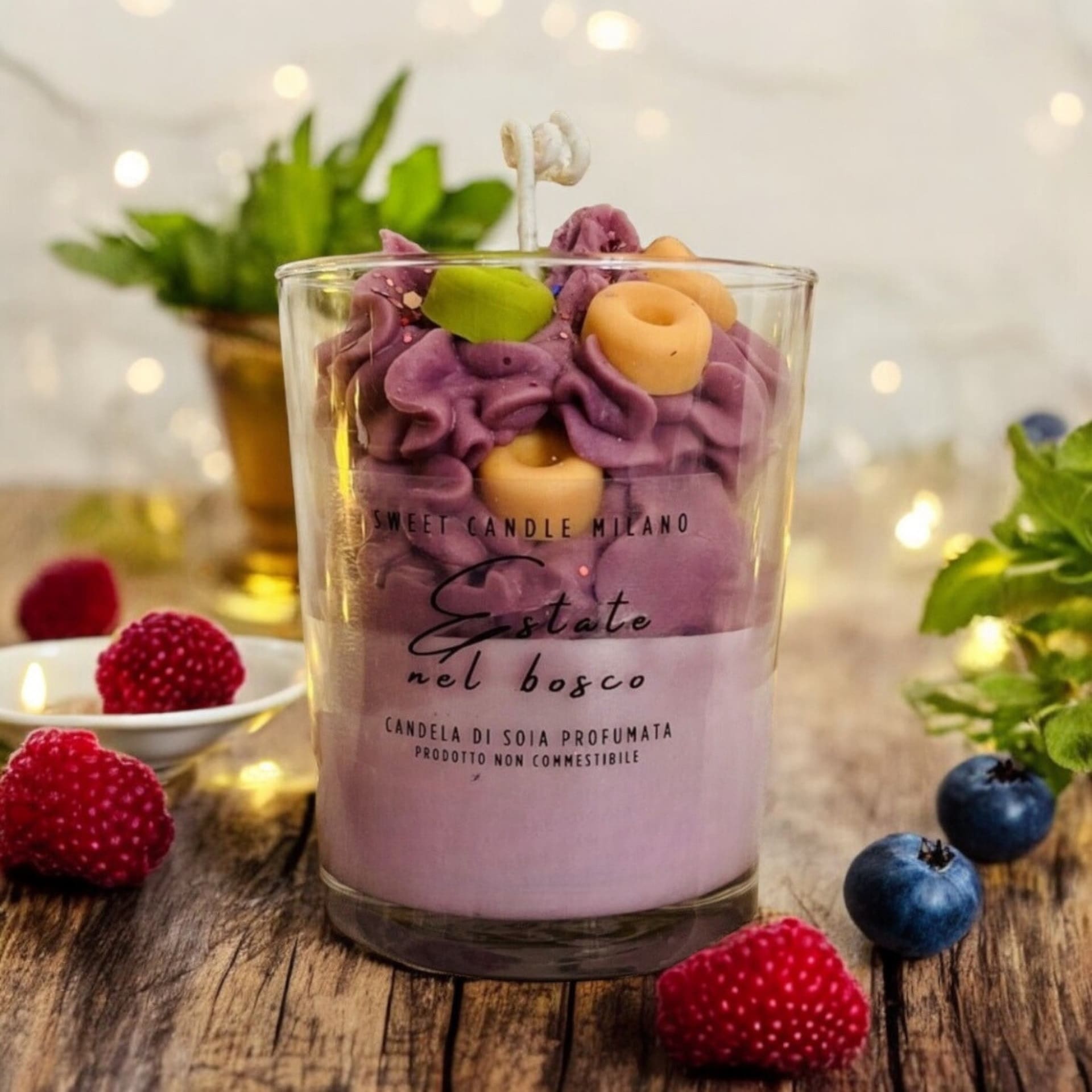 Estate nel bosco è una candela di soia realizzata con ingredienti naturali e profumata con oli essenziali puri. La combinazione irresistibile di lampone, bubble gum, menta di pepe e mirtillo crea un bouquet olfattivo unico, ispirato ai dolci piaceri della vita. La fragranza fruttata si diffonde delicatamente nell'aria, trasportandoti in un mondo di dolcezza e freschezza. Il suo design a forma di dessert aggiunge un tocco di eleganza e originalità ad ogni ambiente. I profumi avvolgenti di lampone e mirtillo si fondono armoniosamente con la dolcezza del bubble gum e la freschezza vivace della menta di pepe. Realizzata con cura e attenzione ai dettagli, la nostra candela a forma di dessert è il regalo perfetto per chi ama le fragranze fruttate e desidera un tocco di originalità nella propria casa.